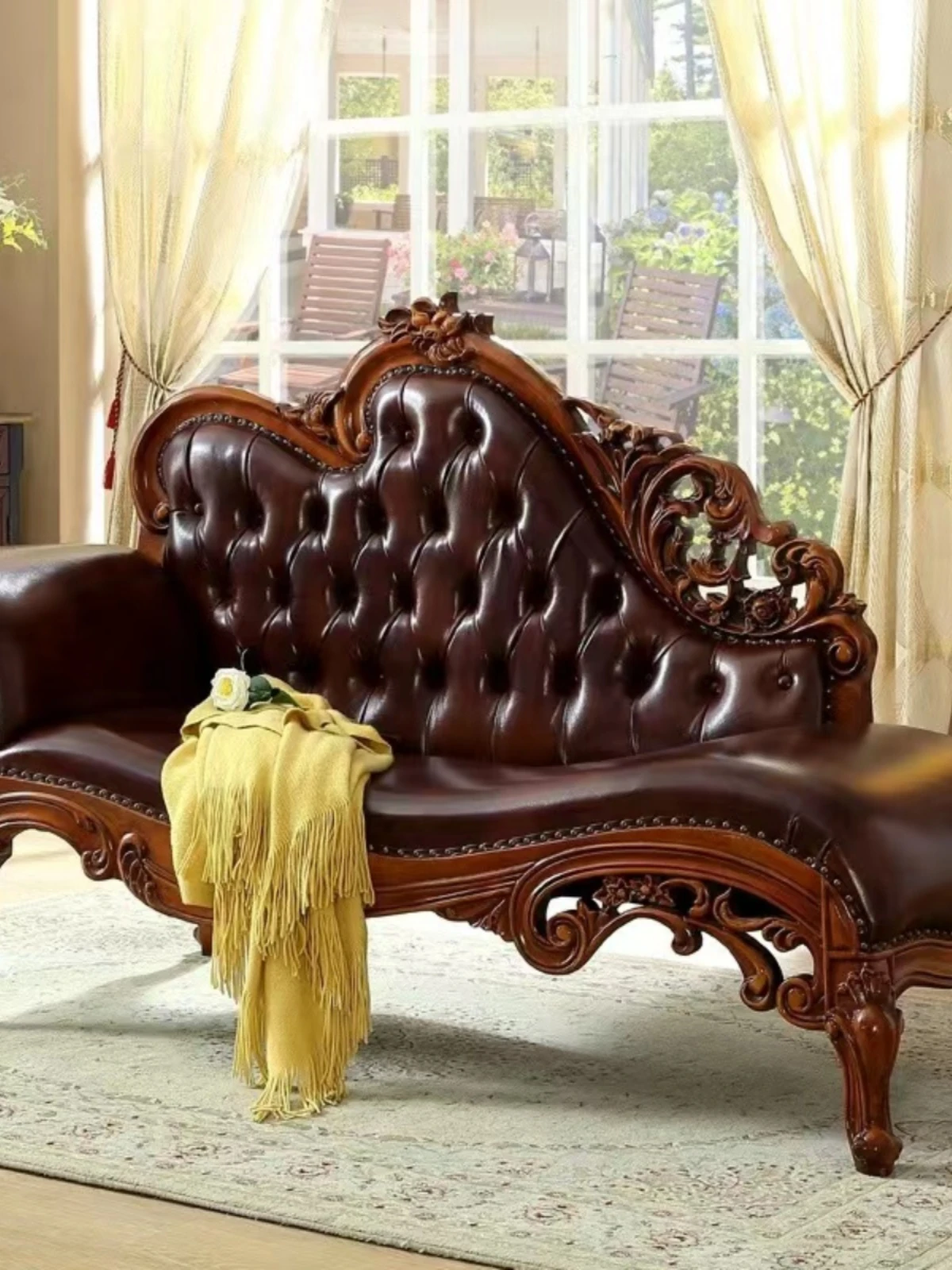 アメリカンスタイルの無垢材製カウチチェア|一人掛け・二人掛けレザーソファ|欧風彫刻デザインのリラックスバルコニー用本革ベッド|贅沢なひとときを!