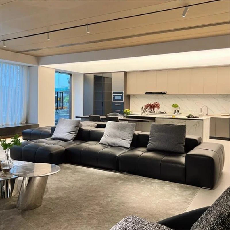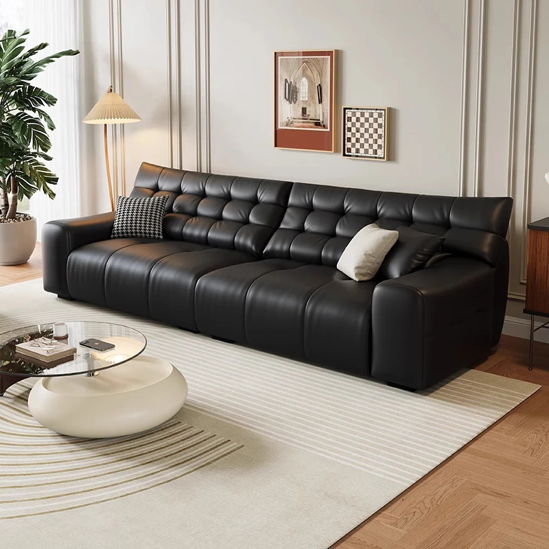 イタリアンミニマリストピクセル本革ソファ - 高級感あふれる本牛革使用、シックなブラックカラーのリビングルーム向け直排ソファセット。スタイリッシュなデザインで、あなたの空間を格上げ!