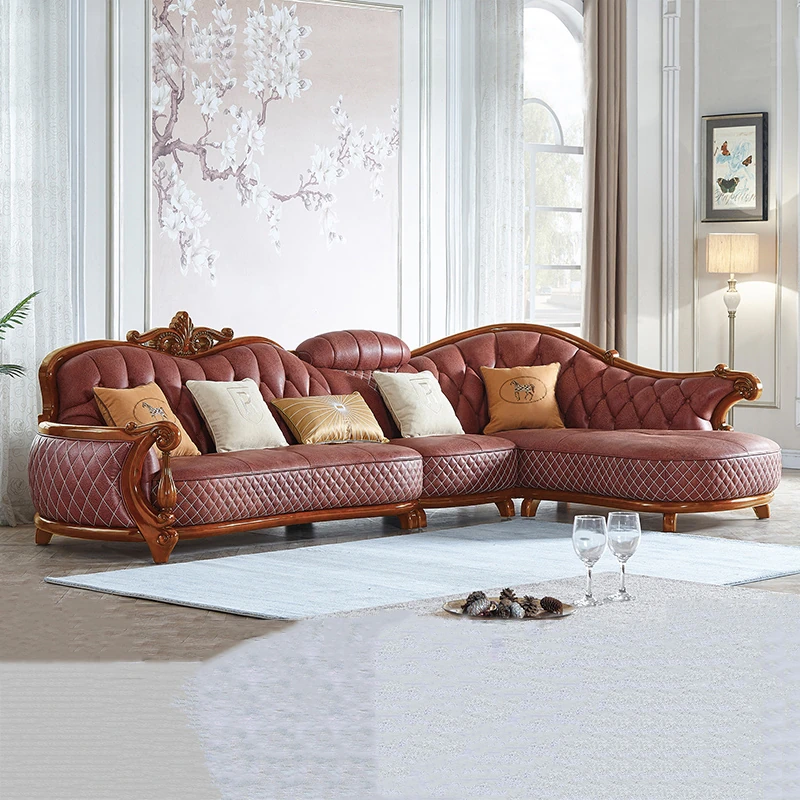 高級欧式本革ソファー|一流の牛革使用|リビングや別荘に最適な木製コーナーソファー|ウッド調のウルシ材仕上げ|大小様々な部屋にフィット!
