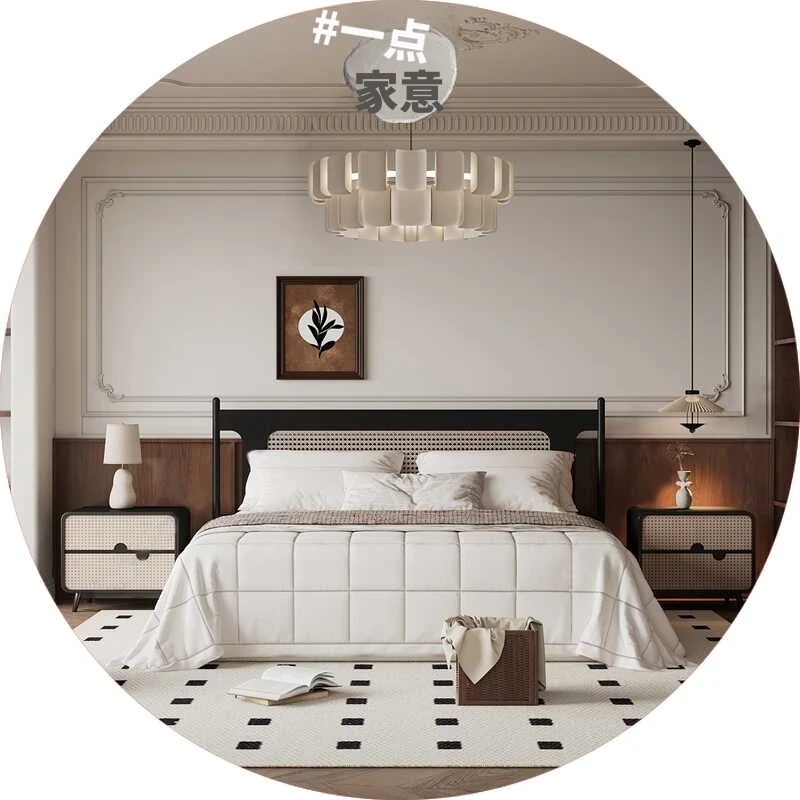現代的シンプルなホテルスタイルの浮遊ベッド|アンティーク風の民宿家具|侘び寂びデザインの柔らかいベッド|主寝室に最適な無垢材とラタン編みのダブルベッド【快適な眠りをお届け】
