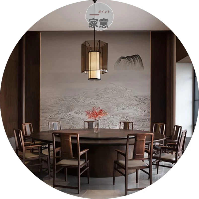 ミニマリスト禅スタイルの大円形ダイニングテーブルセット - 電動回転トレー付き、20人収容可能!民宿、ホテル、レストラン、別荘の個室に最適な洗練されたデザイン。おしゃれで快適な食事空間を演出します。